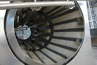由電機(jī)帶動(dòng)中間軸上的鏈輪旋轉(zhuǎn)從而帶動(dòng)滾筒的旋轉(zhuǎn),滾筒上有三個(gè)大法蘭,由六個(gè)托輪支撐,滾筒速度可由電機(jī)作調(diào)整。滾筒內(nèi)壁裝有導(dǎo)料長(zhǎng)條,滾筒內(nèi)有噴淋水管,下方有兩個(gè)水箱,進(jìn)料方噴淋管的水來自出料邊水箱,此水采用循環(huán)水;出料處的噴淋水來自進(jìn)料邊的水箱,此水是清水。